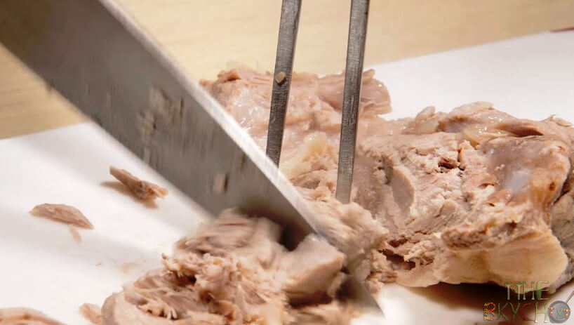 14.Откидываем мясо на доску для мяса. Придерживая этой же вилкой, нарезаем горячее мясо на небольшие кусочки.