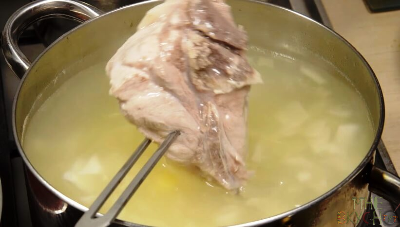 12.Кусок мяса достаем из бульона. Лучше использовать для этого специальную вилку с двумя длинными зубьями. Так гарантированно убережете свои нежные ручки от обжигания.