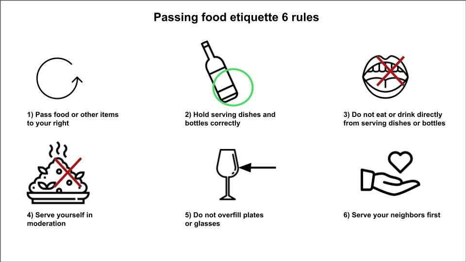 Сначала подавайте основное блюдо, например, рыбу или мясо с соусом или подливкой. Затем раздайте гарниры, такие как овощи. Картофель обычно идет последним.