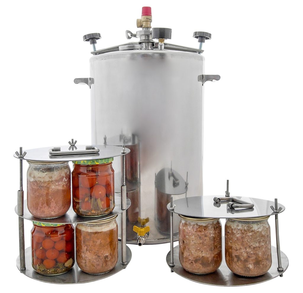 Автоклав для консервирования из нержавеющей стали оснащен биметаллическим термометром и аварийным клапаном в запорной крышке. Рассчитан на 26 л продуктов, позволяет заготавливать дома птицу, рыбу и грибы, делать сладости на зиму.
