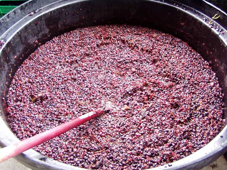 Выжимки используются вместе с гребнями, косточками и недозревшими гроздями, что только усилит виноградный вкус напитка.