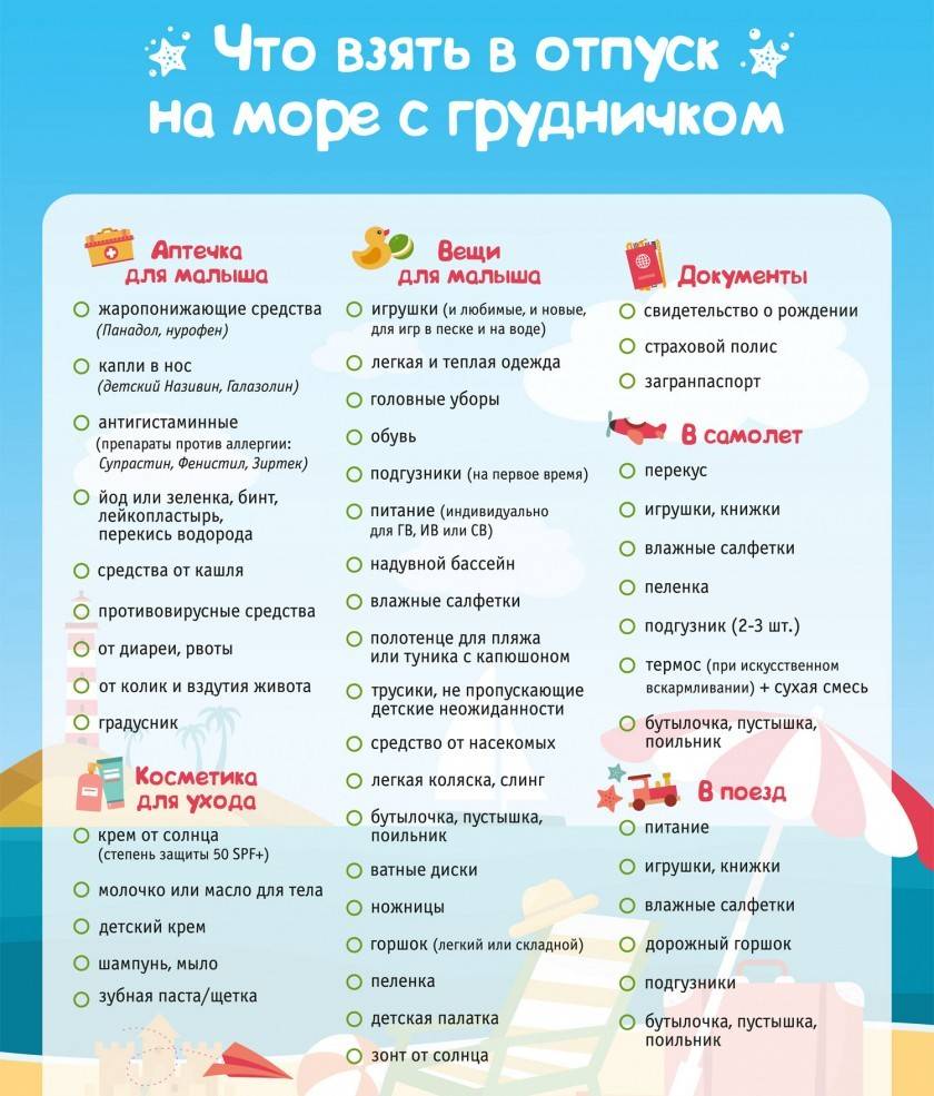Список вещей и принадлежностей для ребенка зависит от возраста малыша. Для грудных детей необходимо взять памперсы, соску, влажные салфетки, пеленки, клеенку и ухаживающие средства (присыпку, кремы). Если малыш на искусственном вскармливании, понадобятся бутылочки и сухие детские смеси, термос с горячей водой.