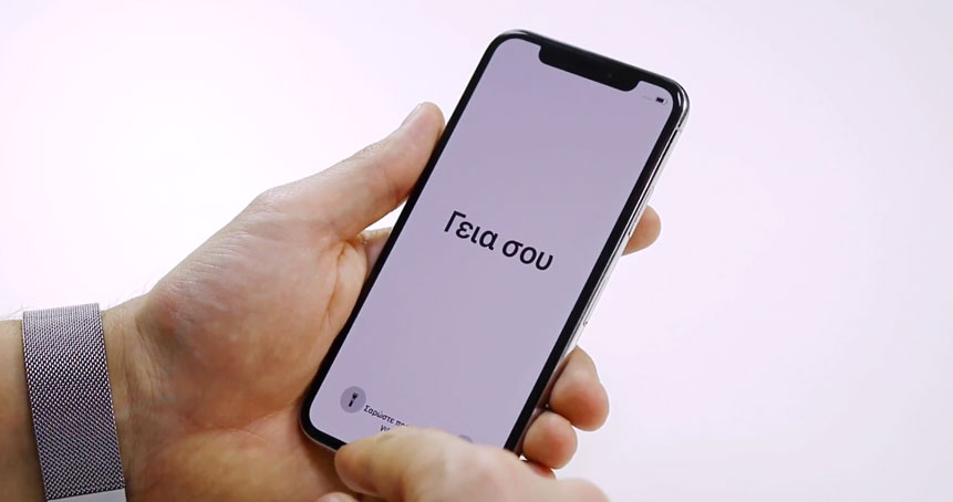 - При включении нового айфона, вы увидите на дисплее приветствие на разных языках мира. Проведите пальцем по экрану, чтобы продолжить.