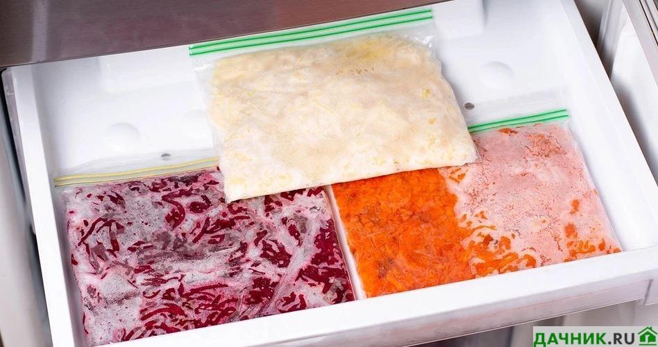 Для заготовки овощи натирают на тёрке. После этого они распределяются по пищевым пакетикам и отправляются в морозилку. Можно замораживать на разделочной доске, а затем замерзшую массу разложить по контейнерам либо пакетам.