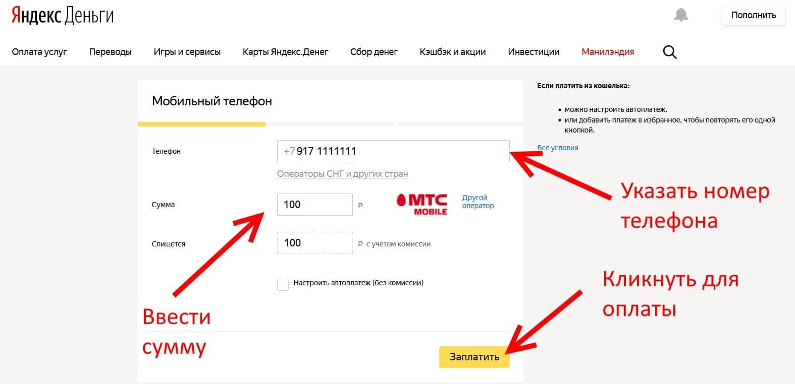 В открывшемся окне указать номер телефона, сумму для пополнения и кликнуть «Заплатить».