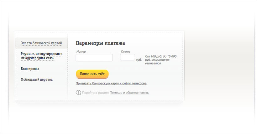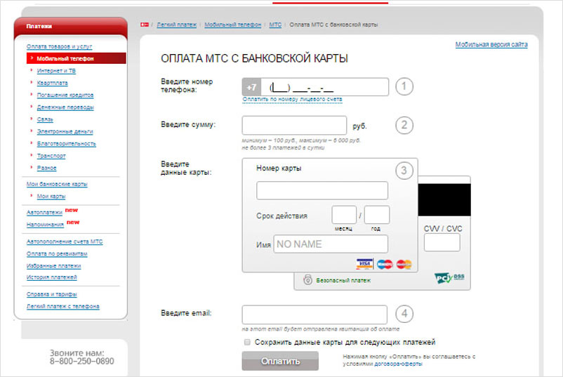 Каждая подобная система содержит специальный пункт, который чаще всего называется «Оплата счета при помощи карты». В данном разделе можно осуществить пополнение баланса мобильного телефона.