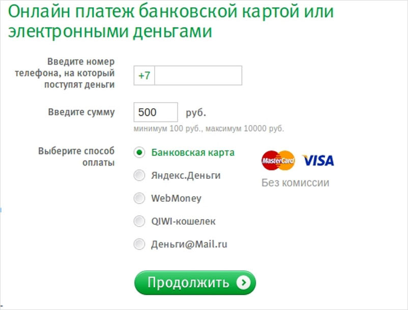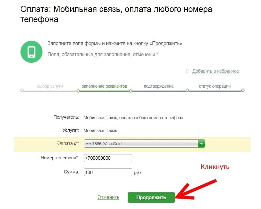 На следующем шаге ввести номер телефона, сумму для зачисления и кликнуть «продолжить».
