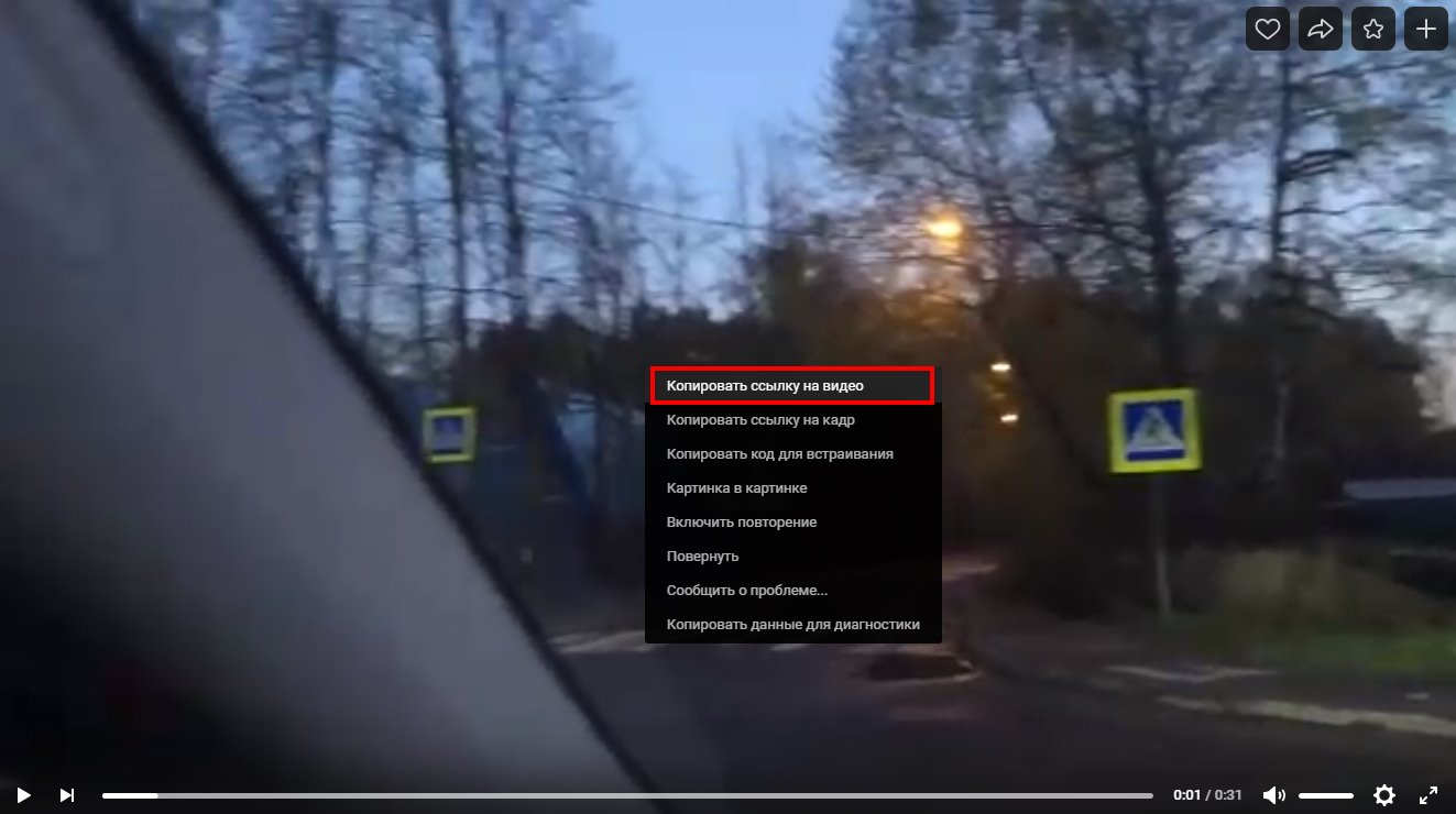 Запустить видео и уже по нему кликнуть правой кнопкой и выбрать «Копировать ссылку на видео».