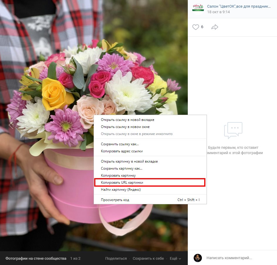 - Нажать на фото ПКМ и сделать копию адреса картинки в буфер обмена.