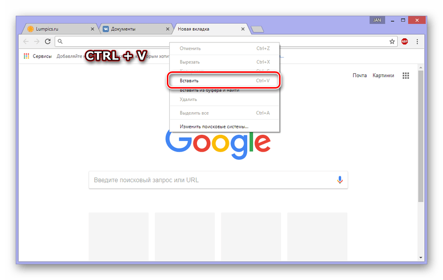 - Выделите текст, находящийся в адресной строке браузера. Либо кликните по нему левой кнопкой мыши три раза. Либо нажмите Ctrl+A.