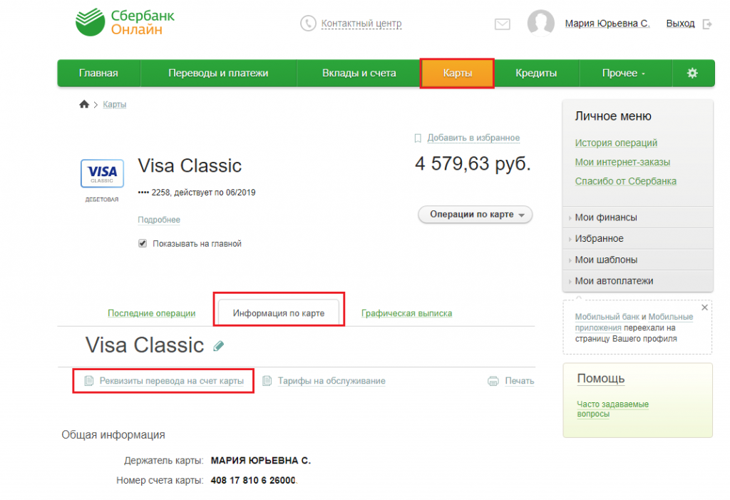 Если клиент уже участник системы «Сбербанк Онлайн», то реквизиты по карте можно узнать через неё. Для этого следует: