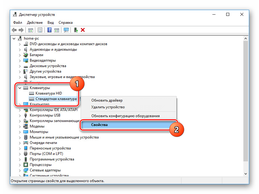 В списке найдите строку «Клавиатуры» и дважды кликните по ней левой кнопкой мыши. Если в выпадающем списке имеются устройства с иконкой стрелочки или тревоги, нажмите ПКМ и выберите пункт «Свойства».