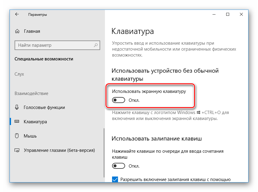 В ОС Windows 10 имеется специальная возможность, заключающаяся в отображении полнофункциональной экранной клавиатуры, о процессе включения которой нами рассказано в соответствующей статье. Она может быть полезна во многих ситуациях, позволяя вводить текст с помощью мыши или касаниями при наличии сенсорного дисплея. При этом данная возможность будет функционировать даже при отсутствии или неработоспособности полноценной физической клавиатуры.