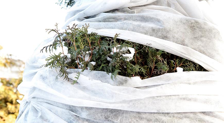 - как самостоятельный утеплитель – материалом обертывают кусты, например, плетистых и штамбовых роз.
