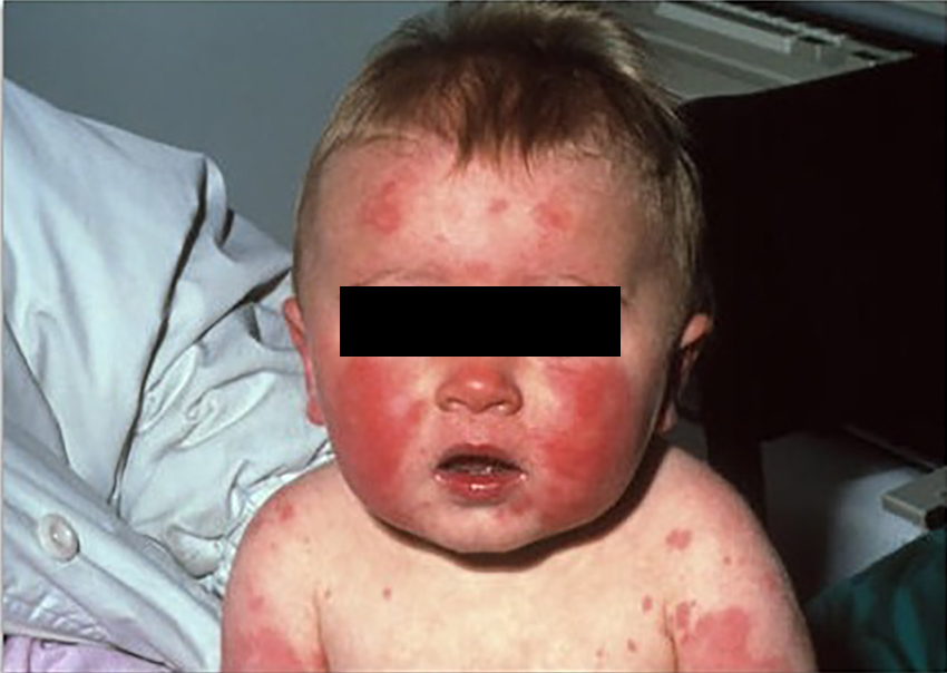 Первыми появляются пятна на щеках. Изначально они имеют вид мелких красных пятнышек, которые быстро сливаются в эритему. Через несколько дней сыпь на лице становится менее заметной и одновременно с этим образуются пятна на теле. Ребенок заразен только в период до появления сыпи! Иногда у малыша наблюдается повышенная температура.