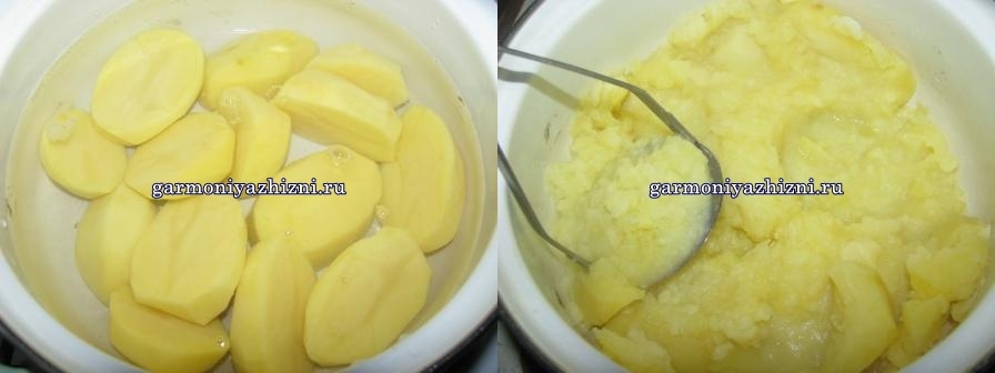 Разминаем картофель в пюре, добавляя оставленных полстакана воды. При толчении можно картофель немного подсолить, но если у вас капуста солёная, то делать этого не нужно.