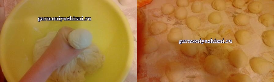 У меня тесто было в полиэтиленовом пакете, я переложила его в пластмассовую миску. Потом смазала руки растительным маслом и выдавливала небольшие шарики (диаметром примерно 3-4 см) между большим и указательным пальцами. Стол нужно посыпать мукой и выложить получившиеся шарики, оставив на 10 минут, чтобы тесто снова подошло.