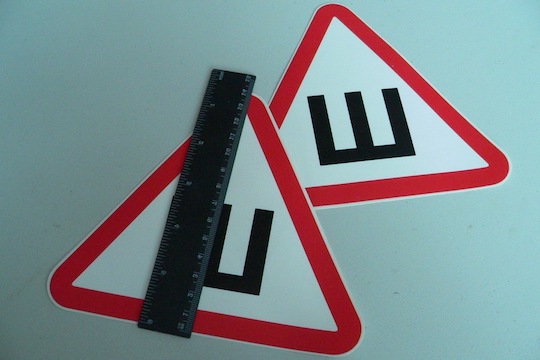 - мати вигляд білого трикутника з червоною облямівкою і чорною буквою «Ш» по центру;