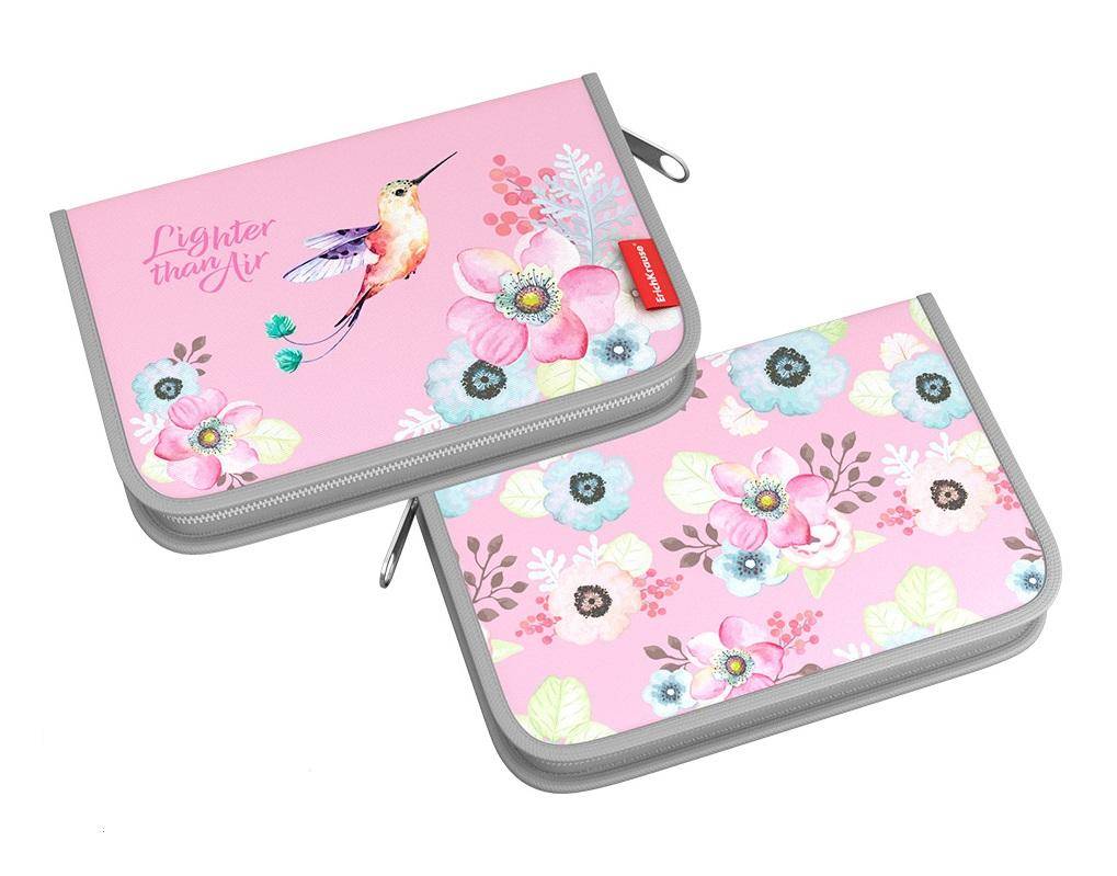 Жестко-каркасный пенал-книжка в красивом дизайне – розовая база с изображением цветов, птицы колибри. Для контраста кайма отделена серым пастельным оттенком. Производителем выступает российский бренд канцелярских товаров «ErichKrause».