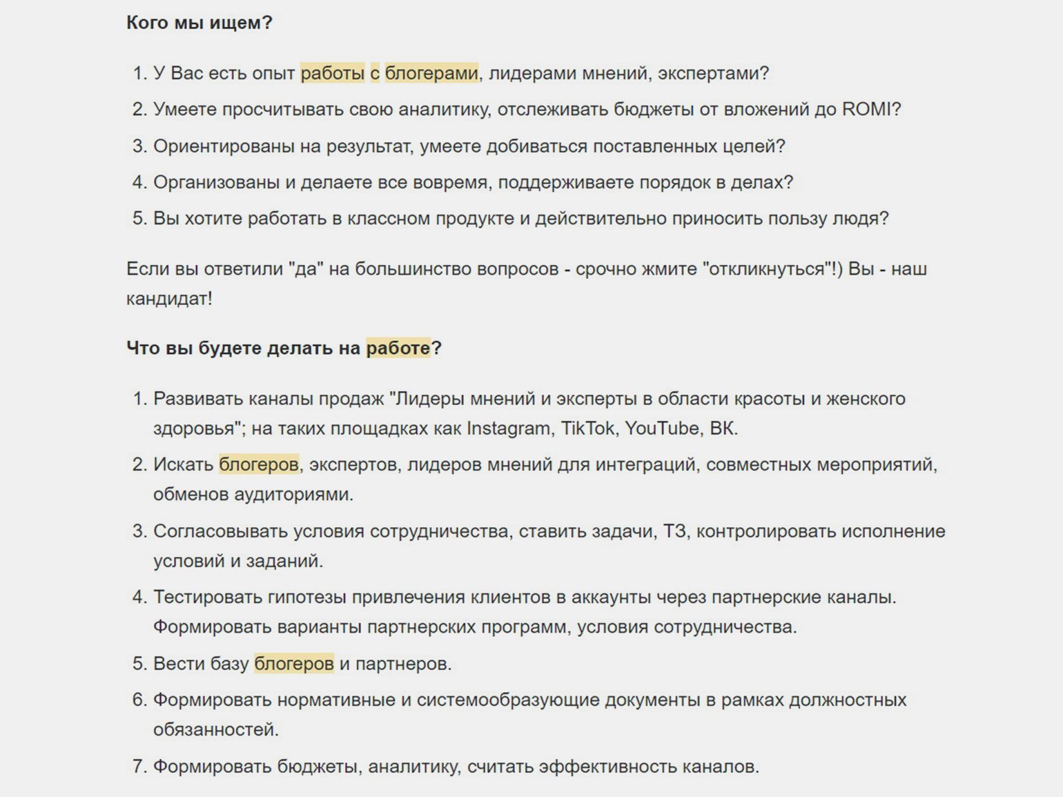 Ещё менеджер по работе с блогерами может передавать ТЗ, решать спорные вопросы, вести отчётность об интеграциях и анализировать эффективность рекламы. Но это чаще делают опытные специалисты, а не новички.