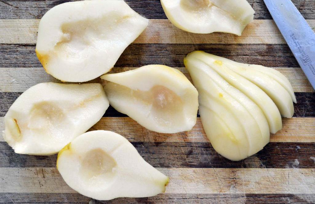 - Нарежьте чистые груши кусочками, добавьте половину указанного количества воды, проварите на медленном огне до мягкости, отставьте для остывания.