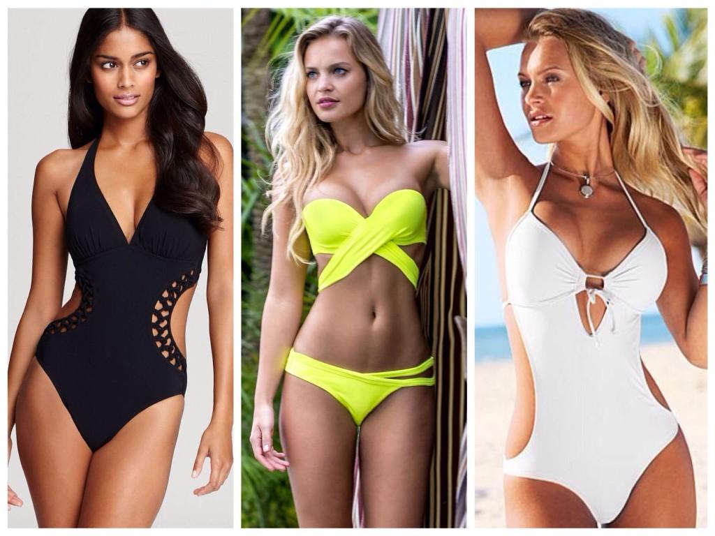 Обратите внимание на: купальники халтер (завязки на шее), танк (широкие лямки лифа), глубокий пландж (V-образный вырез)