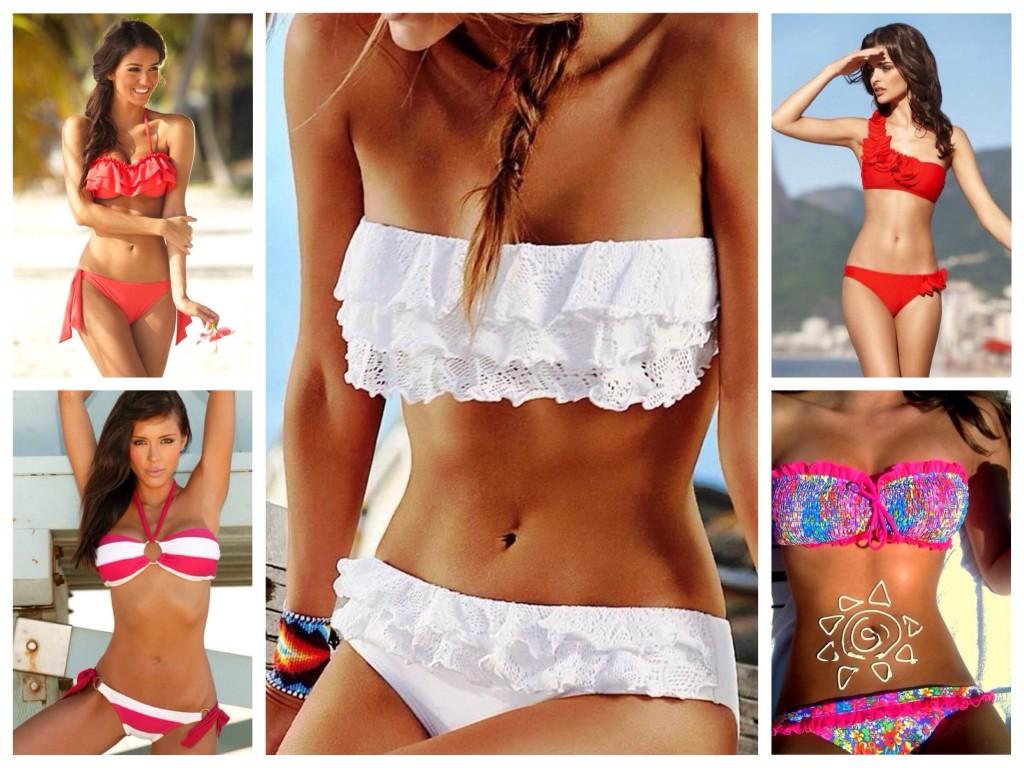 В раздельном купальнике низ должен производить впечатление большего объема, чем вверху. То есть быть ярким, с объемными элементами, декором, придающий дополнительный объем (завязки, рюши, драпировки, оборки). А также трусики и шортики с завышенной талией.