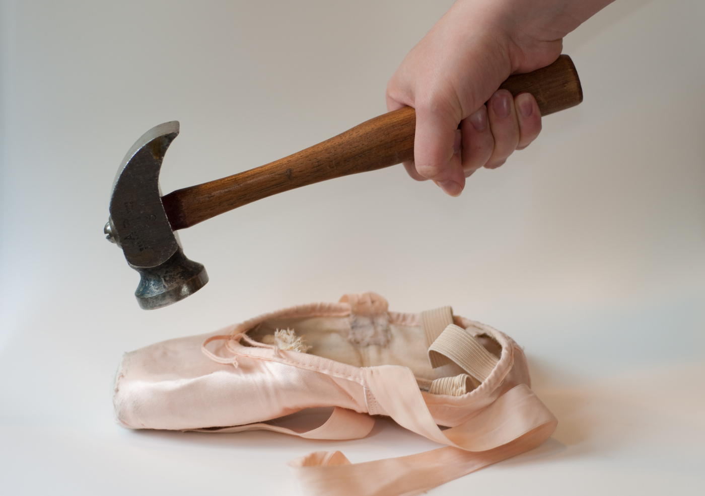 - разминает небольшим молоточком жесткую коробочку туфель;