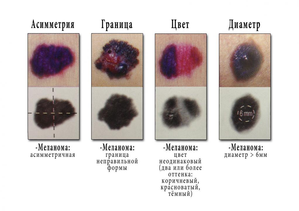 Неровность края. Наличие изломов и нечеткости может быть признаком злокачественности. Цвет. Неооднородность окраски, а также наличие вкраплений разного цвета должно настораживать. Также к врачу нужно обращаться, если невус меняет цвет. Диаметр. Пристального осмотра врача требуют невусы, имеющие более 6 мм в диаметре. Изменчивость. Любые изменения в состоянии родинки, ее внешнем виде и ощущениях являются довольно тревожными.