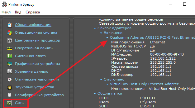После запуска программы откройте раздел «Сеть». Здесь будет вся возможная информация о ваших сетевых подключениях и сетевых картах.