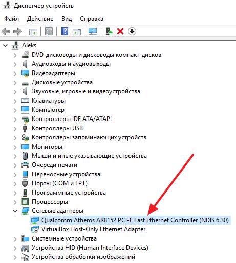 После открытия «Диспетчера устройств», раскройте список «Сетевые адаптеры». В данном списке вы увидите название сетевой карты, которая установлена на вашем компьютере.