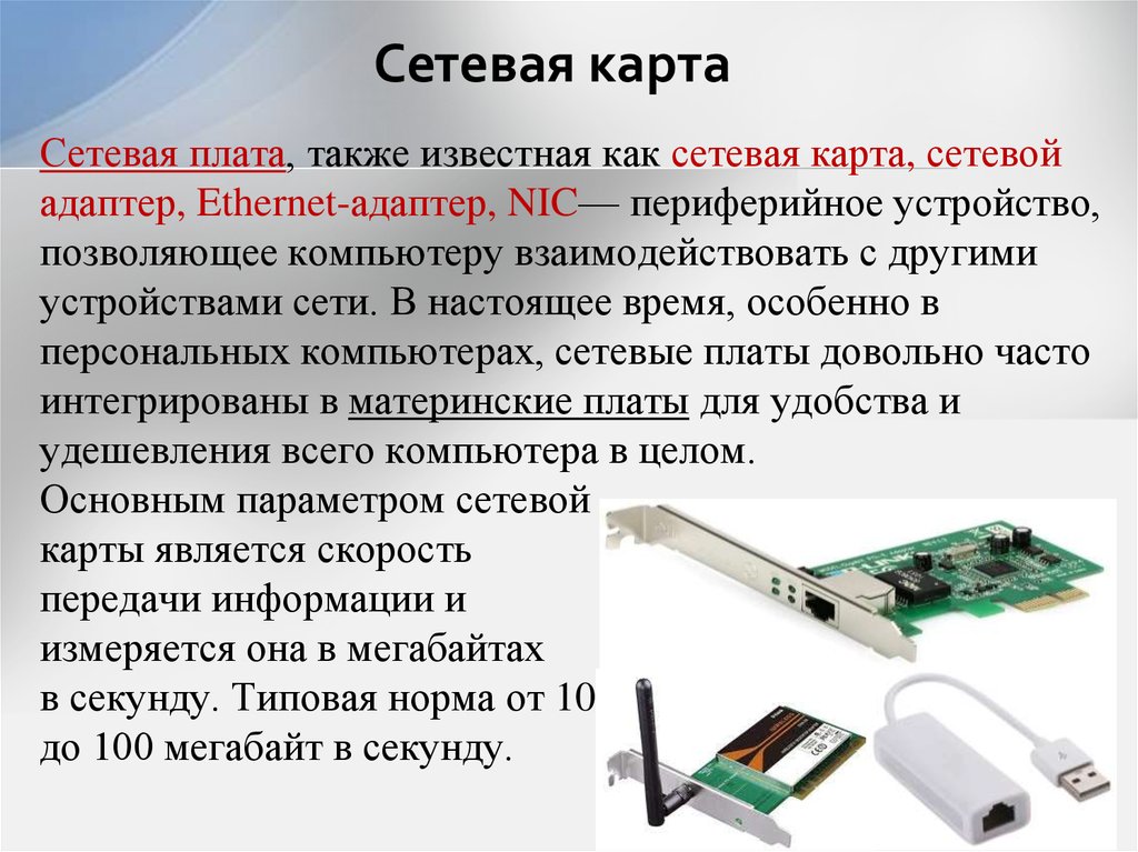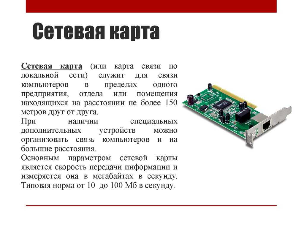 Основная характеристика сетевой карты является пропускная способность. Чем она больше, тем выше скорость работы устройства.