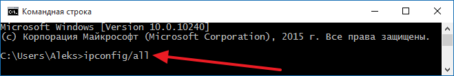 После открытия командной строки в ней нужно выполнить команду «ipconfig/all».