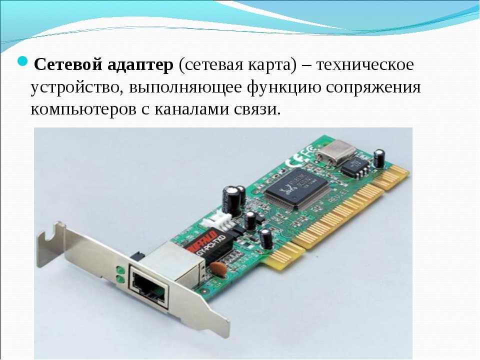 Сетевая карта или по-иному сетевой адаптер служит для передачи/приема данных. Причем обмен данными с помощью этого устройства обеспечивается как для проводной сети, так и для беспроводной. Для этого и существуют различные виды сетевых адаптеров.