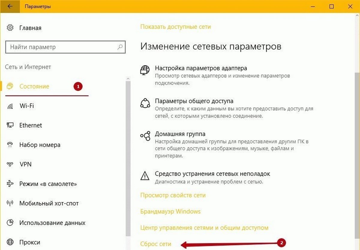 Чтобы осуществить сброс сети, перейдите по пути «Параметры» – «Сеть и Интернет» – «Состояние» и справа выберите пункт «Сброс сети». Под перенастройкой адаптера подразумевается удаление его упоминаний из системы, после чего необходимо перезагрузить систему Windows, чтобы она могла автоматически обнаружит его как новое устройство и установить драйвера из собственной базы.