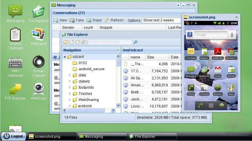Простая программа, создающая в вашем браузере виртуальный рабочий стол Android-устройства. Подходит для передачи файлов между девайсами, прослушивания музыки и видео. Имеет слегка запутанный интерфейс.