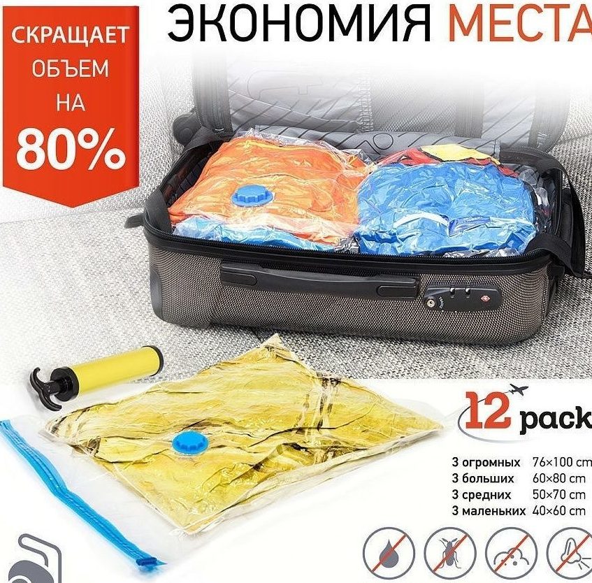 Набор вакуумных пакетов Wonder Worker Press включает изделия 4 размеров, 76х100,60х80, 50х70, 40х60. В комплекте есть насос и 12 упаковок. Использовать вакуумный пакет Wonder Worker отличная идея для поездки или хранения вещей. Вакуум держится долго, а благодаря универсальным размерам в наборе, вакуум становится вместительней!
