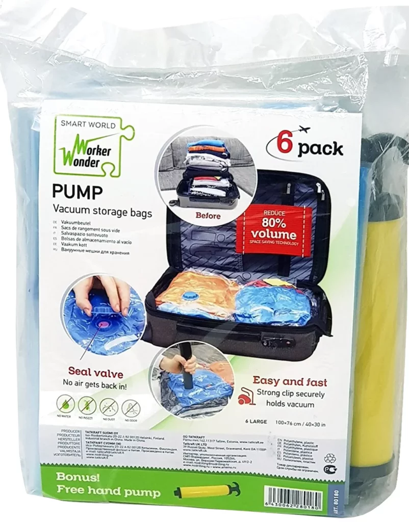 Набор вакуумных пакетов Wonder Worker Pump представляет 6 пакетов размером 100х76 и ручной насос. Отличным дополнением является усиленный клапан, который не пропускает воздух и отлично справится с защитой вещей от влаги, пыли, насекомых и посторонних запахов! Вакуумный пакет отлично справится с экономией места.