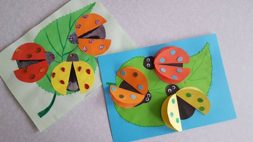 Божья коровка проста в изготовлении. Вырезаем два кружка из красной бумаги и два полуовала из черной. Кружки сгибаем пополам и наклеиваем одну половину на основу. Полуовал-голову присоединяем посередине над кругами. Осталось на них нарисовать черные точки и дополнить всё глазками и усиками.