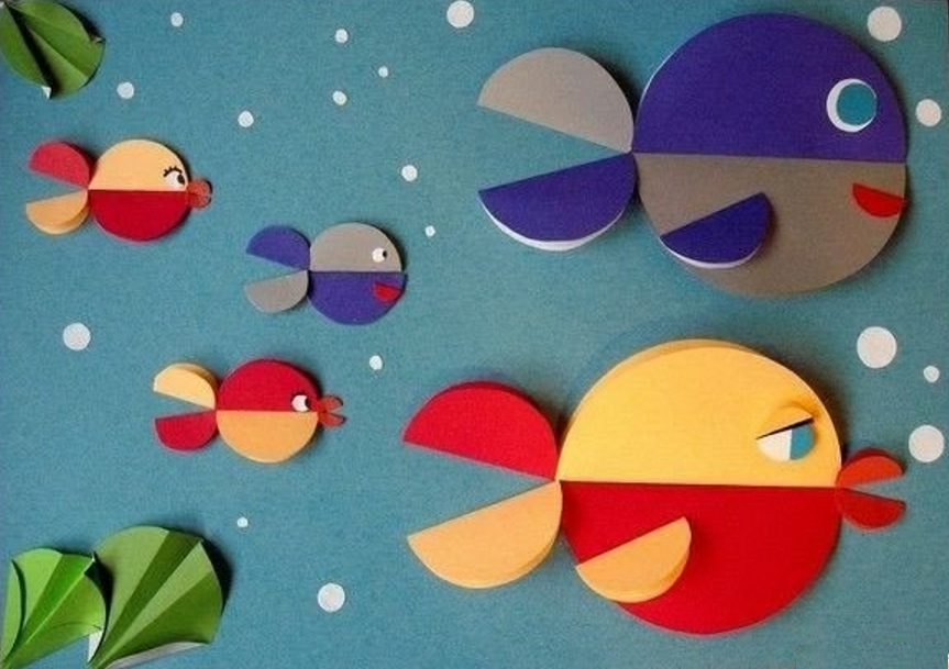 Если работу полностью сделать из кружков – она получится необычной и интересной. Например, для того, чтоб создать рыбку, понадобится большой круг бумаги.