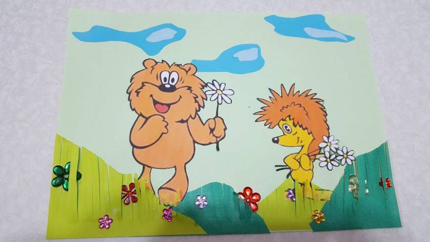Заранее нарисовав контур и выбрав необходимые цвета, можно создать шедевр из кусочков. Например, для медвежонка понадобится бумага коричневого, черного, желтого, белого и красного цветов. Обрывные кусочки должны получиться примерно одного и того же размера и соединяться друг с другом как пазлы.