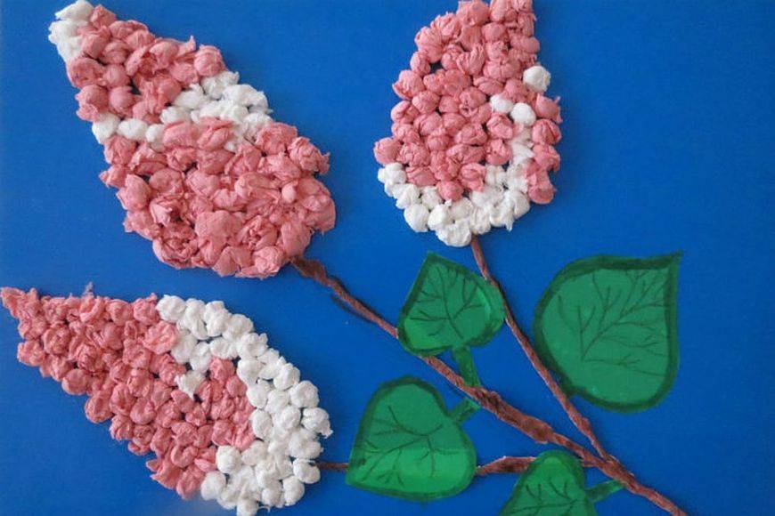 Стоит использовать белые, розовые или фиолетовые салфетки. Нужно вырезать из цветной салфетки силуэт заранее продуманной формы и размера соцветия. Затем наклеиваем его на основу. Далее режем салфетки на маленькие квадраты. Одни из них комкаем сразу, другие – тоже комкаем, но сначала разрываем на кусочки. Комочки приклеиваем к силуэту и так, чтобы между ними не было промежутка. Цветок готов!