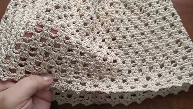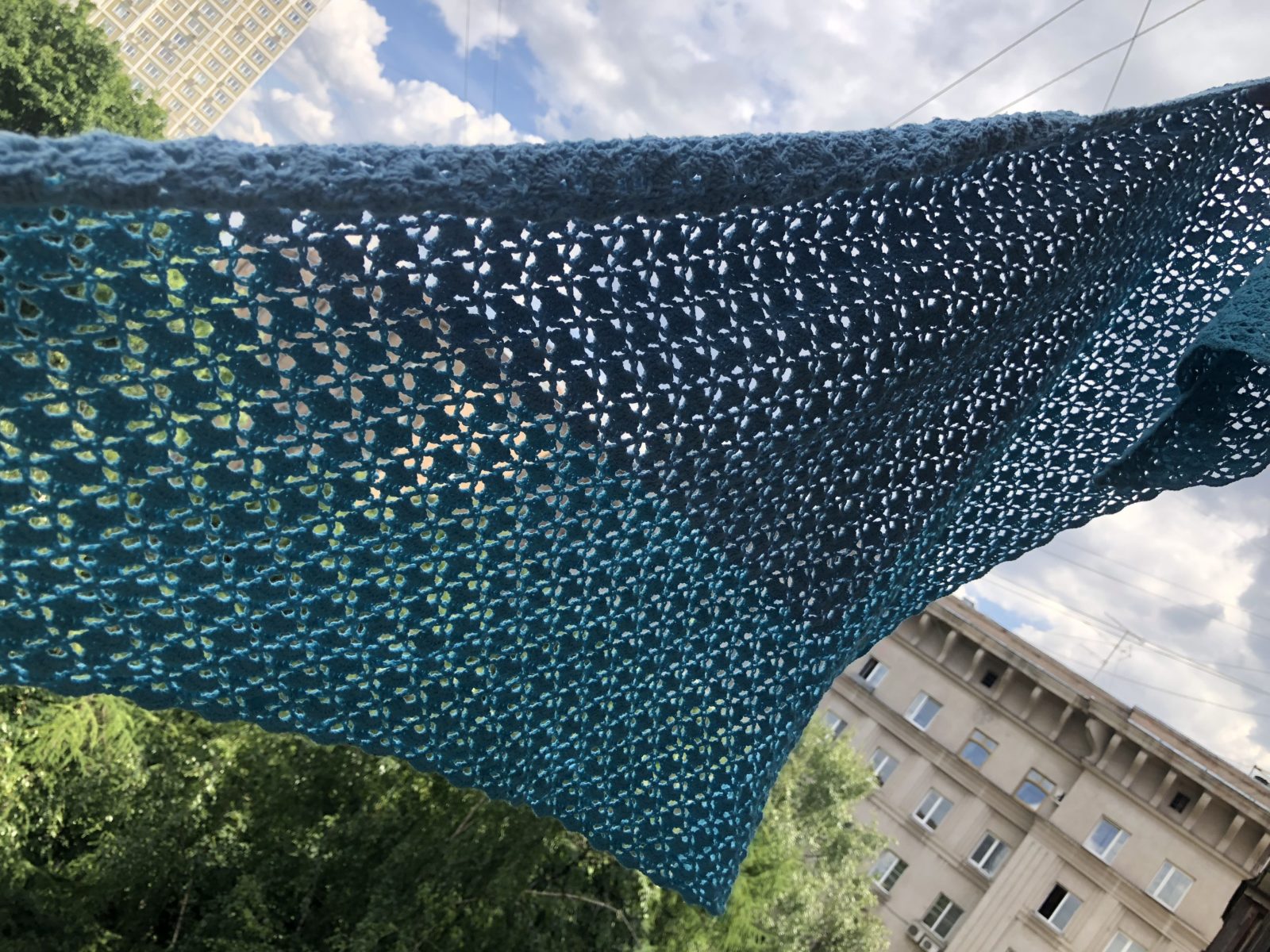 В заключение по всему периметру косынки необходимо провязать один ряд полустолбиками. Желательно простирнуть готовое изделие, слегка растянуть и высушить на махровом полотенце.