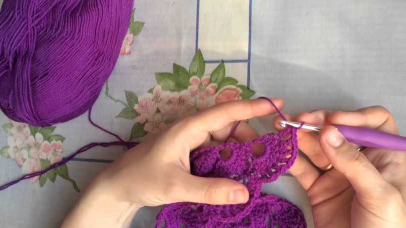 - соединить арту необходимо нак., В арку вплетаются три пропила. Через три доп. Провязать нак в следующей арке. Отношения повторяются на второй стороне. Закройте накид и проработайте одну деталь из девяти петель нак. После снова вяжется п и центральный элемент. То же и со второй стороной.