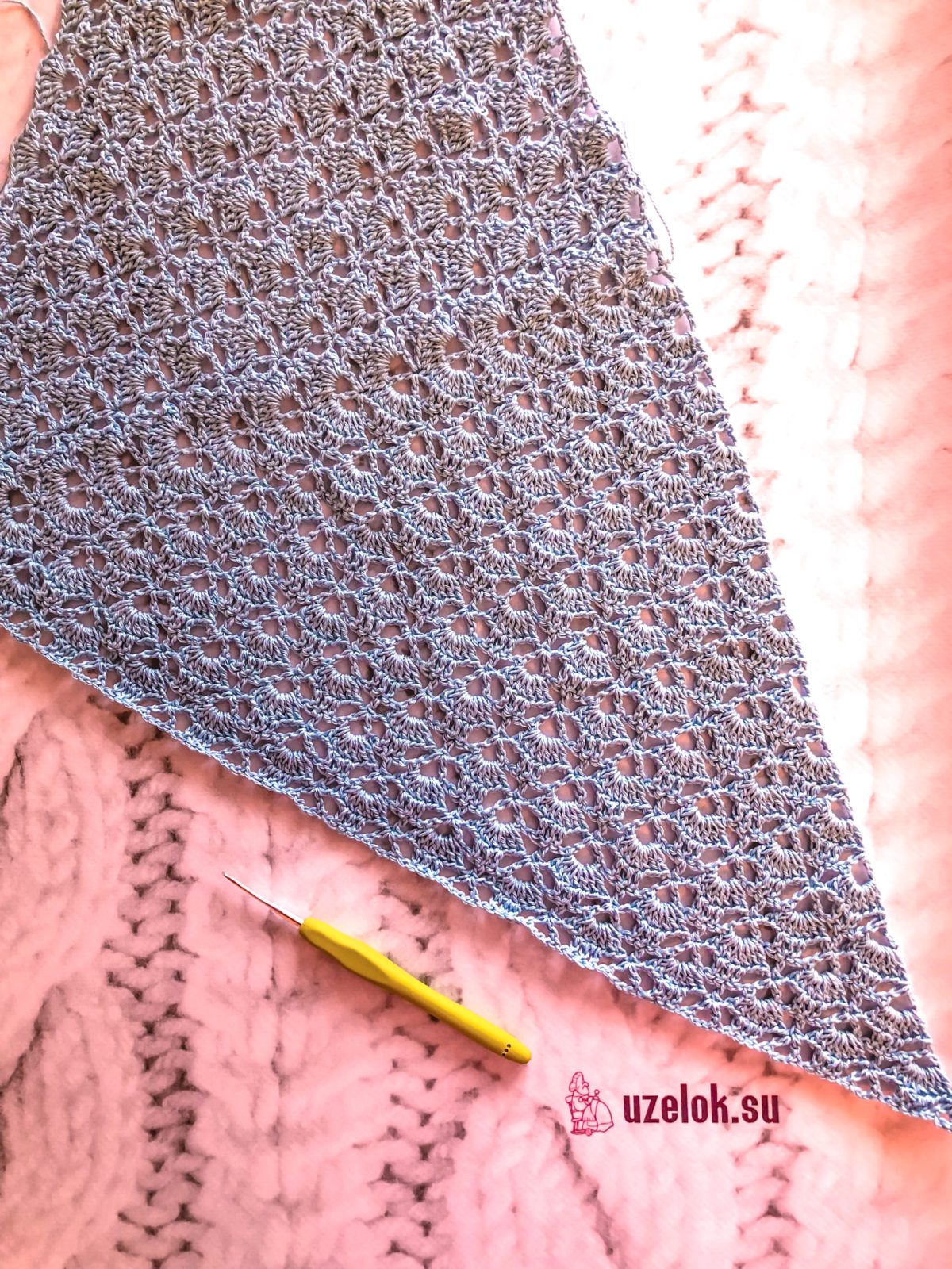 - В зависимости от того, какая схема вязания бактуса крючком выбрана, можно вязать поперек, начинать с длинной стороны косынки или с угла.