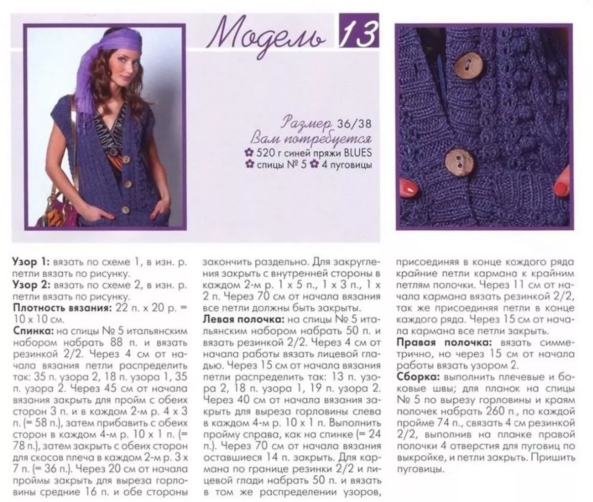 Эта модель жилетки с воротом на пуговицах связана спицами рельефным узором.