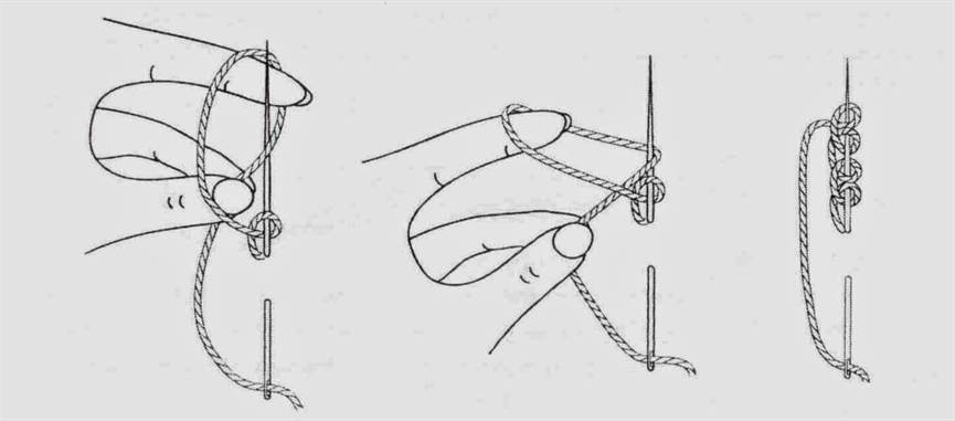 Выполняется тонкой иглой и нитью, заведенной вдвое. Нить не просто навивается вокруг иглы, она заворачивается определенным образом, как это показано на схеме.