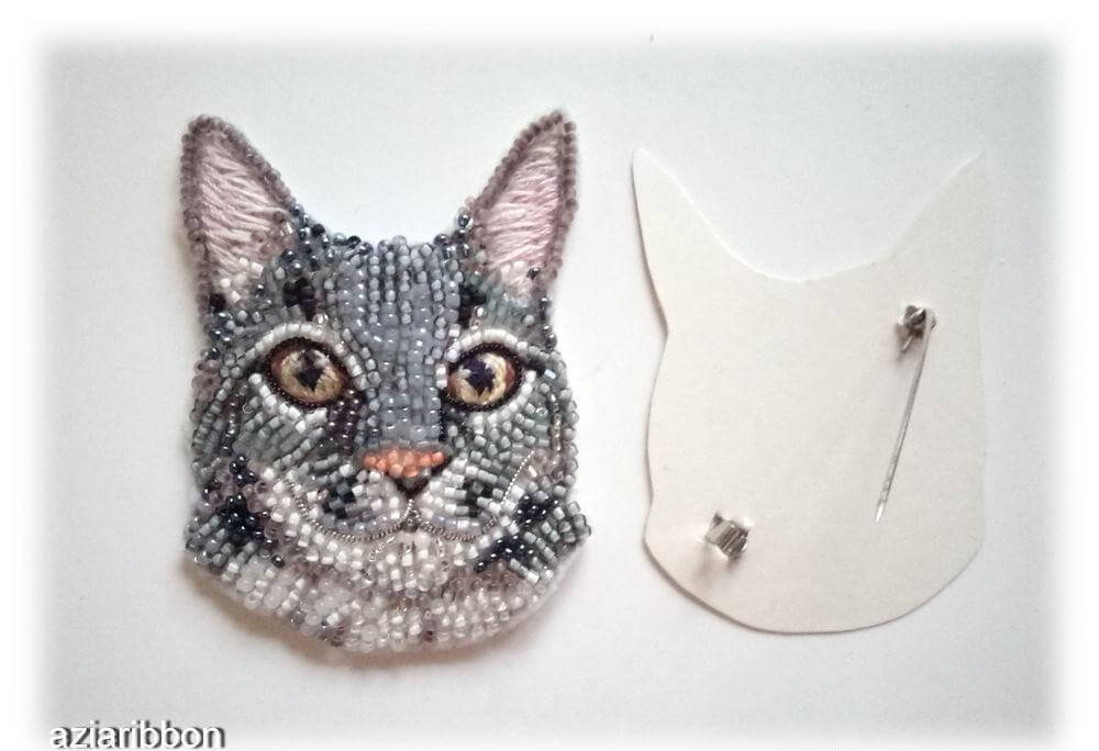 Такую милую брошь в виде кошки несложно сделать своими руками. Для работы понадобится бисер, канитель черная и серебристая. Канитель — это тонкая металлическая проволока, скрученная в спираль. Используется в вышивке, создает рельеф, контур, объем изображения.