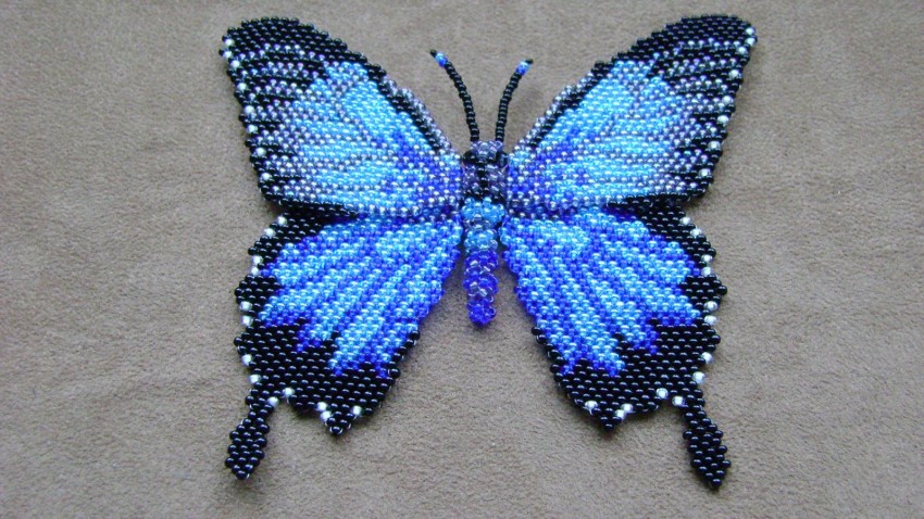 Бабочка из бисера для брошки готова, вырезаем её по краям фигуры. Это нужно делать аккуратно, чтобы не повредить нить, которой сшивался вышитый контур. Остаются нюансы, придающие бисерной основе реалистичный вид.