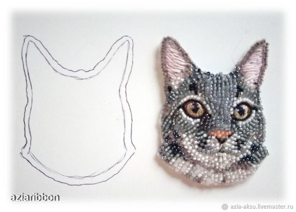 Здесь, в мастер-классе, автор берет по 2 бисерины, и применяет арочный шов. Старайтесь вышивать в направлении роста шерсти кошки. Внутренние части ушей бисером не заполнены, обшиты только контуры ушек. Далее, нитью Мулине вышиваем внутри ушка.